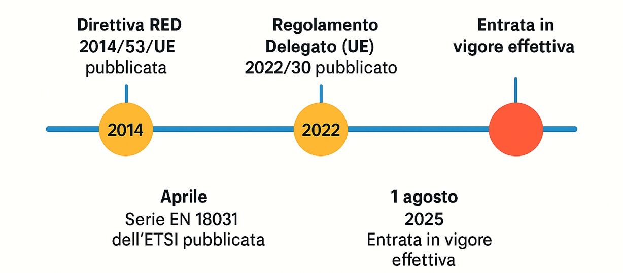 Il punto centrale di questa nuova ondata normativa è la Direttiva RED (2014/53/UE)[1], affiancata dal Regolamento Delegato UE 2022/30[2] e dagli standard EN 303 645[3] e EN 18031.